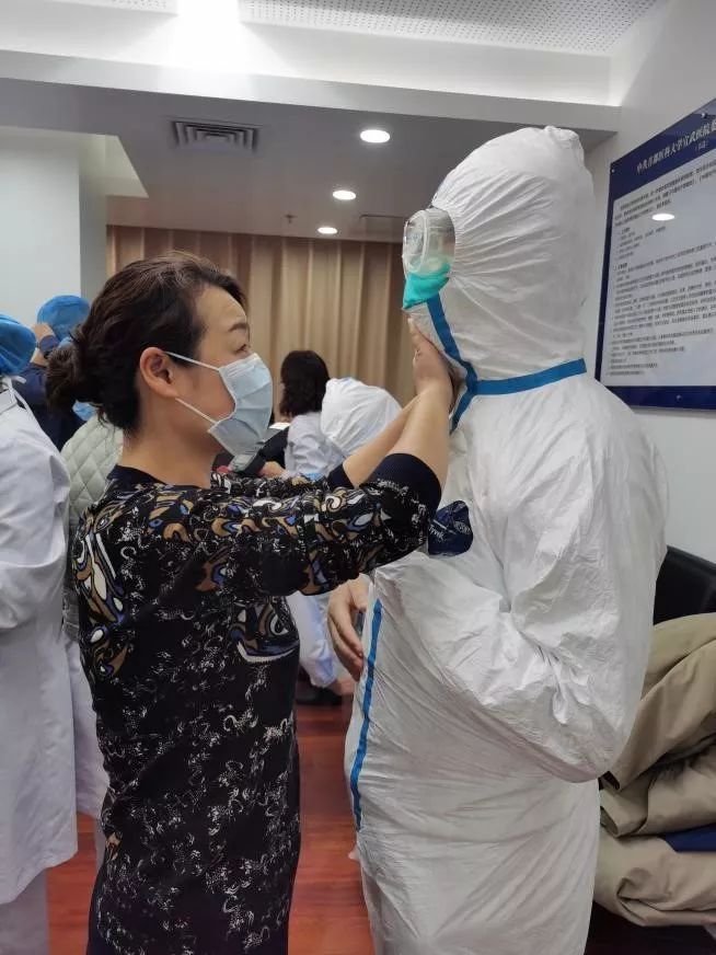 ?。▓D說:出發(fā)前,首都醫(yī)科大學(xué)宣武醫(yī)院在全員培訓(xùn)的基礎(chǔ)上,對醫(yī)護人員進行穿脫防護服等感染防控加強培訓(xùn)。在現(xiàn)場,首都醫(yī)科大學(xué)宣武醫(yī)院呼吸科副主任醫(yī)師肖漢(右),他的愛人北京醫(yī)院醫(yī)務(wù)處副處長潘琪(左)正在用自己的專業(yè)知識,幫助丈夫規(guī)范穿戴防護服。)