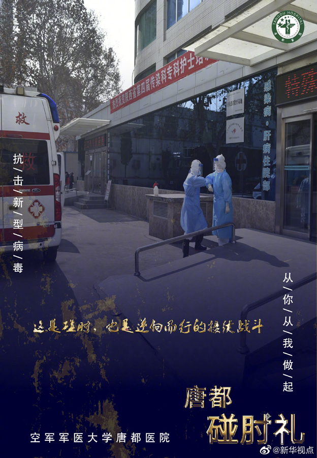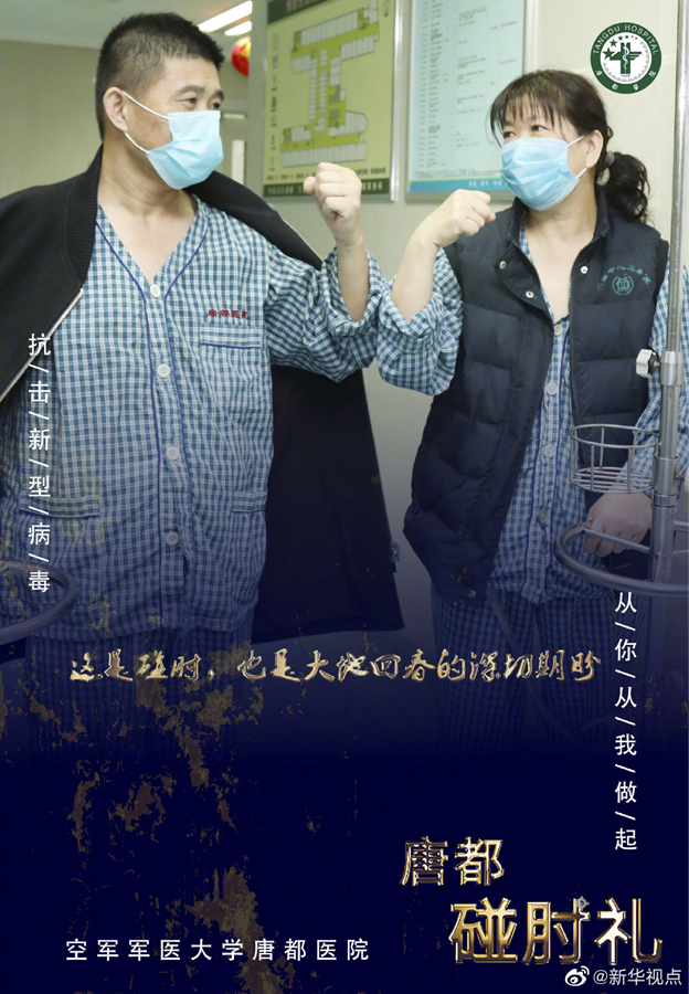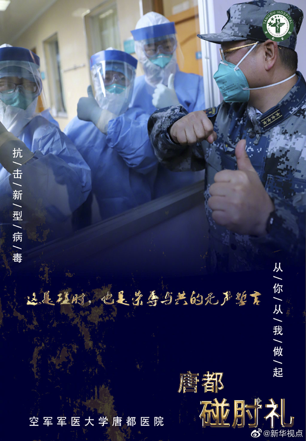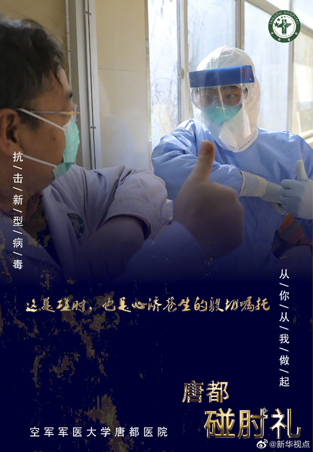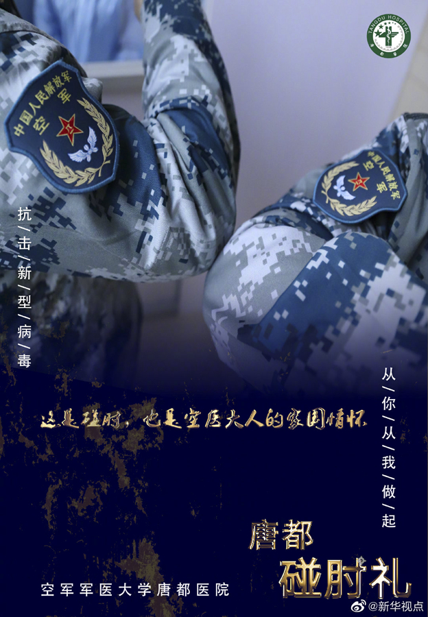 疫情當(dāng)前,空軍軍醫(yī)大學(xué)唐都醫(yī)院的醫(yī)護(hù)人員在抗擊疫情的同時(shí),用新的肢體語(yǔ)言——“碰肘禮”,相互問候,相互加油。肘碰肘,心連心,萬(wàn)眾一心,定能戰(zhàn)勝病毒。(文字藺娟;圖片由空軍軍醫(yī)大學(xué)唐都醫(yī)院提供) ????