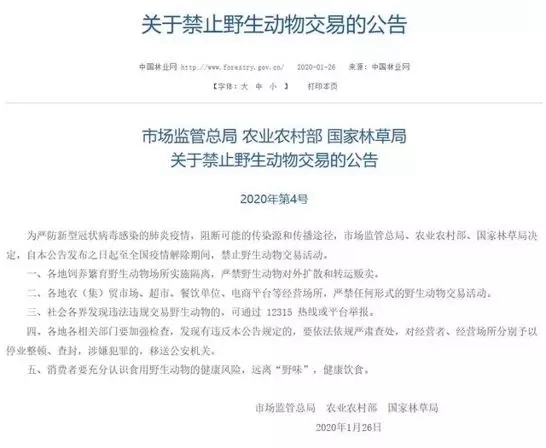 為此,國(guó)家市場(chǎng)監(jiān)管總局、農(nóng)業(yè)農(nóng)村部、國(guó)家林業(yè)和草原局26日聯(lián)合發(fā)布公告要求,即日起至全國(guó)疫情解除期間,禁止野生動(dòng)物交易活動(dòng),以斬?cái)嗖《镜膫魅驹春蛡鞑ネ緩健?/p>