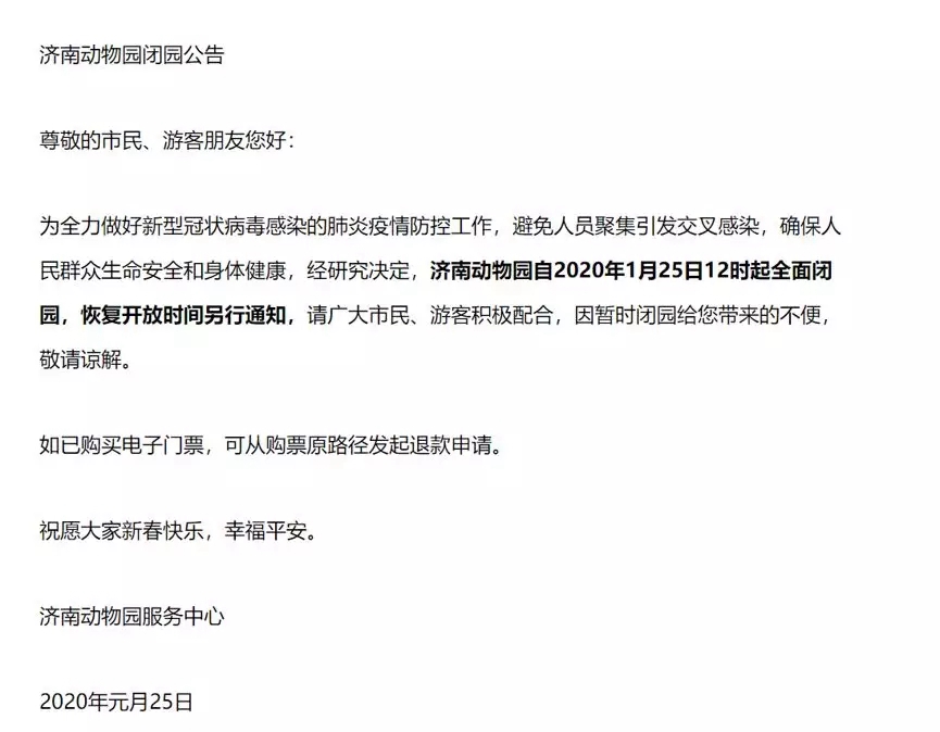 吉林、山東、湖北等地宣布叫停與野生動(dòng)物相關(guān)一切交易和展演活動(dòng)。陜西省林業(yè)局出臺(tái)十項(xiàng)措施,確保人與動(dòng)物的安全距離。1月22日起,武漢市動(dòng)物園、九峰森林動(dòng)物園等景區(qū)都已經(jīng)暫停對(duì)外開放。原本計(jì)劃春節(jié)不打烊的濟(jì)南野生動(dòng)物世界,從1月25日12時(shí)起就宣布閉園。飼養(yǎng)員每天按照既定的消毒制度,對(duì)籠舍及舍外活動(dòng)場(chǎng)進(jìn)行消毒。