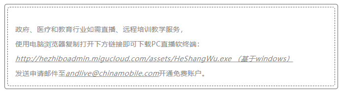 中國移動教育名師直播課堂免費提供在線課程學(xué)習(xí)和遠程直播教學(xué)平臺,掃碼可領(lǐng)取可免費課程資源,使用直播能力可撥打4001100868。中國移動企業(yè)和商務(wù)直播為政府、醫(yī)療和教育行業(yè)提供直播、遠程培訓(xùn)教學(xué)服務(wù),符合條件的用戶可使用直播普及疫情防控知識,或使用電腦進行遠程培訓(xùn)教學(xué)等。