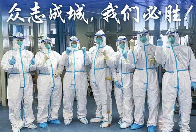 1月24日,武漢大學中南醫(yī)院重癥隔離病房內(nèi)的醫(yī)護人員一起鼓勁加油。