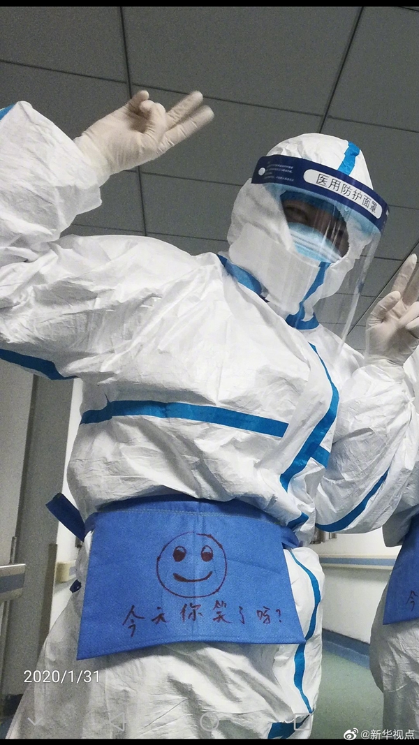 在武漢金銀潭醫(yī)院南四病區(qū),由于防護(hù)服是連體的,沒有口袋,護(hù)士巡視輸液時(shí)需要簽名,筆、對(duì)講機(jī)等小件物品沒地方放,為了工作方便,科室護(hù)士的爸爸媽媽親手幫他們做了這個(gè)“愛心腰包”,護(hù)士長(zhǎng)吳靜還在上面畫上了笑臉,鼓勵(lì)病人和醫(yī)護(hù)人員都要樂觀面對(duì)。(記者侯文坤、胡喆)