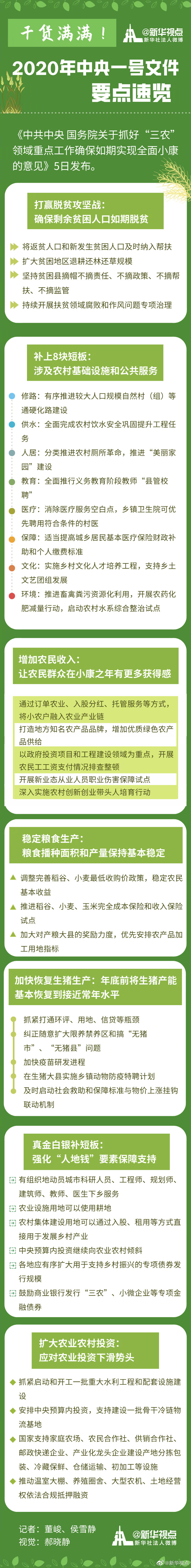 《中共中央 國務院關于抓好“三農(nóng)”領域重點工作確保如期實現(xiàn)全面小康的意見》5日發(fā)布。針對集中力量完成打贏脫貧攻堅戰(zhàn)和補上全面小康“三農(nóng)”領域突出短板這兩大重點任務,文件有哪些干貨、硬貨? ?