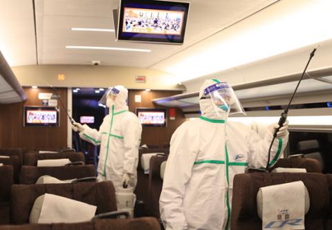 2月4日,中國鐵路北京局集團有限公司對返回北京動車段的復興號進行車內(nèi)消毒作業(yè)。張晴/攝