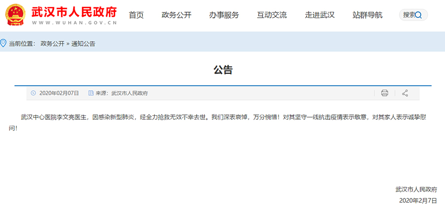 武漢中心醫(yī)院李文亮醫(yī)生,因感染新型肺炎,經(jīng)全力搶救無效不幸去世。我們深表哀悼,萬分惋惜!對(duì)其堅(jiān)守一線抗擊疫情表示敬意,對(duì)其家人表示誠(chéng)摯慰問!