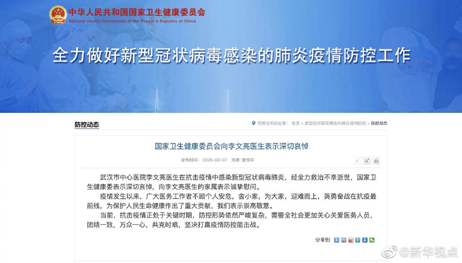 武漢市中心醫(yī)院李文亮醫(yī)生在抗擊疫情中感染新型冠狀病毒肺炎,經全力救治不幸逝世,國家衛(wèi)生健康委表示深切哀悼,向李文亮醫(yī)生的家屬表示誠摯慰問。