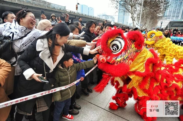 2019年元宵,武漢市民爭相摸“獅子頭”求新年好運