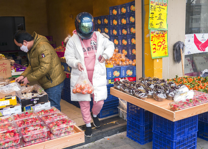 2月8日,在武漢市江漢區(qū),一名女子外面戴著摩托車(chē)頭盔,里面戴著口罩在水果店采購(gòu)。