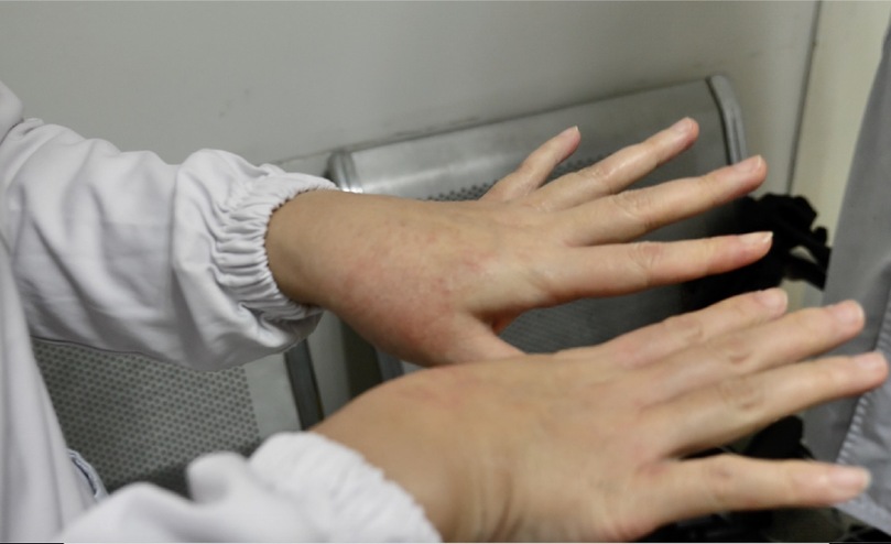 “昨天工作的時候,我們里面的衣服都是濕了又干,干了又濕,來回得三遍。今天的工作算比較輕松一點?!敝x芳笑笑說,衣服沒濕。