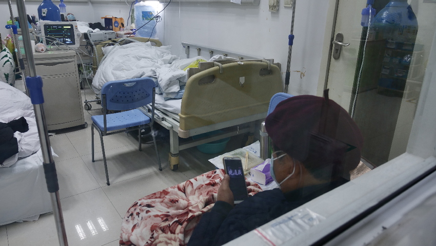 晚上十點鐘,發(fā)熱門診里僅能聽見護士的腳步聲,患者的咳嗽與喘氣聲。留觀室大多數(shù)病人已經(jīng)入睡,但有一位戴著棗紅色帽子的老爺爺,他插著氧氣管仍坐著,捧著手機看電視劇。