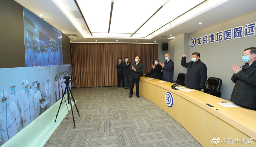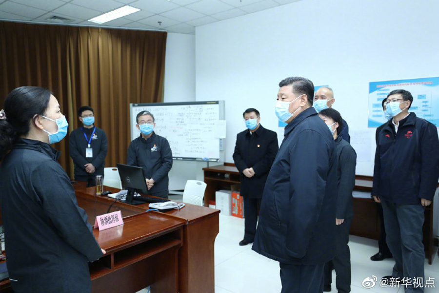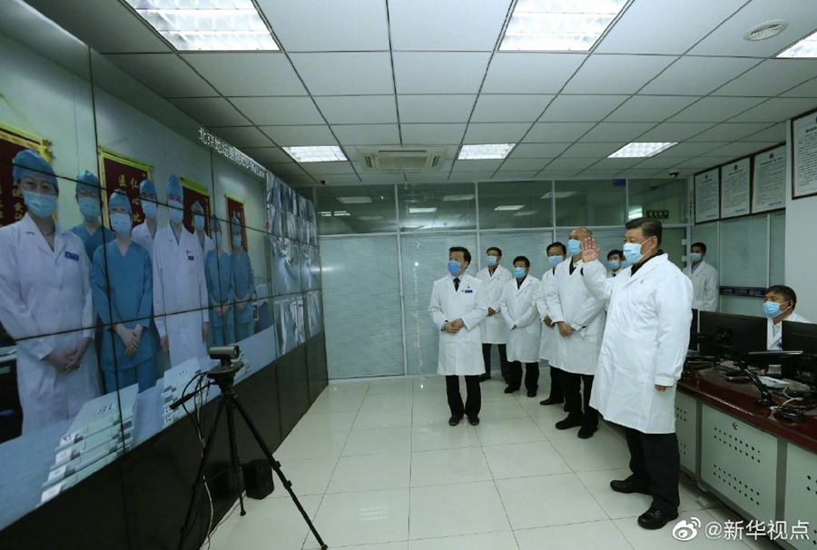 10日下午,習(xí)近平來(lái)到北京地壇醫(yī)院,察看新冠肺炎感染者住院診療情況,視頻連線武漢市重癥患者收治醫(yī)院,聽(tīng)取中央指導(dǎo)組、湖北指揮部有關(guān)情況匯報(bào),慰問(wèn)奮戰(zhàn)在一線的醫(yī)務(wù)工作者。隨后,習(xí)近平前往朝陽(yáng)區(qū)疾病預(yù)防控制中心,了解朝陽(yáng)區(qū)開(kāi)展應(yīng)急處置、流行病學(xué)調(diào)查、篩查報(bào)告和北京市疫情防控工作情況。(文字記者張曉松 攝影記者鞠鵬、謝環(huán)馳、劉彬)?