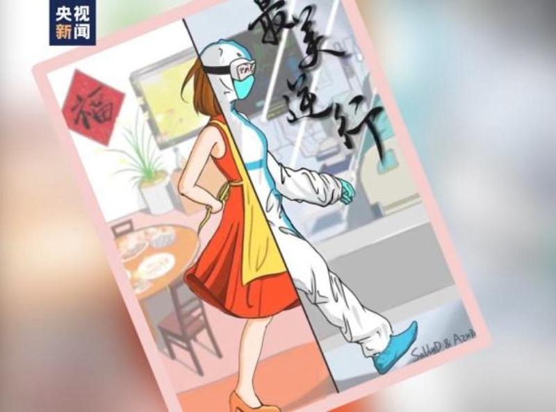 設(shè)計(jì)師董思喬的母親,是北京大學(xué)人民醫(yī)院的一名醫(yī)務(wù)工作者。在董思喬七歲那年,正逢非典暴發(fā),她的母親堅(jiān)守崗位留在醫(yī)院救治患者。十七年后,新冠肺炎來襲,她看到很多醫(yī)務(wù)工作者也像當(dāng)年她的母親一樣在最危險(xiǎn)的地方戰(zhàn)斗,義無反顧,馳援武漢。于是,她拿出畫筆畫出她心中醫(yī)務(wù)工作者們最美的樣子:“身后,是飄香的飯菜,是溫馨的家;面前,是防疫一線,是需要救治的患者。逆行者們,愿你們平安歸來?!?/p>