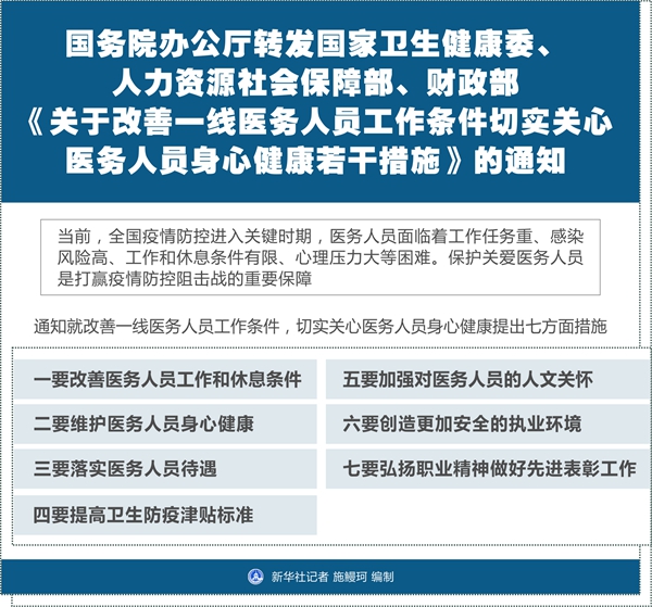 通知就改善一線醫(yī)務人員工作條件,切實關心醫(yī)務人員身心健康提出七方面措施。一要改善醫(yī)務人員工作和休息條件。加強醫(yī)務人員職業(yè)暴露的防護設施建設和設備配置,重點改造醫(yī)生辦公室、值班室和休息室。為醫(yī)務人員提供良好后勤服務,保障醫(yī)務人員充足的睡眠和飲食。二要維護醫(yī)務人員身心健康。合理安排醫(yī)務人員作息時間。對于因執(zhí)行疫情防控不能休假的醫(yī)務人員,在防控任務結束后,由所在醫(yī)療衛(wèi)生機構優(yōu)先安排補休。允許需要緊急補充醫(yī)護人員等疫情防控工作人員的相關醫(yī)療衛(wèi)生機構簡化招聘程序。加強醫(yī)務人員個人防護,組織做好一線醫(yī)務人員健康體檢,最大限度減少院內感染。加強心理危機干預和心理疏導,減輕醫(yī)務人員心理壓力。三要落實醫(yī)務人員待遇。為疫情防控一線醫(yī)務人員和防疫工作者發(fā)放臨時性工作補助。向防控任務重、風險程度高的醫(yī)療衛(wèi)生機構核增不納入基數的一次性績效工資總量。開通醫(yī)務人員工傷認定綠色通道。四要提高衛(wèi)生防疫津貼標準。出臺提高衛(wèi)生防疫津貼標準的政策。對參與新冠肺炎疫情防疫人員,要及時足額發(fā)放到位。五要加強對醫(yī)務人員的人文關懷。動員組織社會力量,對一線醫(yī)務人員展開慰問。為一線醫(yī)務人員和家屬建立溝通聯(lián)絡渠道。對家庭困難的一線醫(yī)務人員家屬進行對口幫扶。六要創(chuàng)造更加安全的執(zhí)業(yè)環(huán)境。嚴格落實各項安全防范措施,加大警力投入,完善問責機制,對發(fā)現(xiàn)有歧視孤立一線醫(yī)務人員及其家屬行為的,要及時進行批評教育,情節(jié)嚴重的依法予以處理。對傷害醫(yī)務人員的,要堅決依法嚴肅查處。七要弘揚職業(yè)精神做好先進表彰工作。做好及時獎勵和及時性表彰工作,為做好疫情防控工作增強信心、凝聚力量。