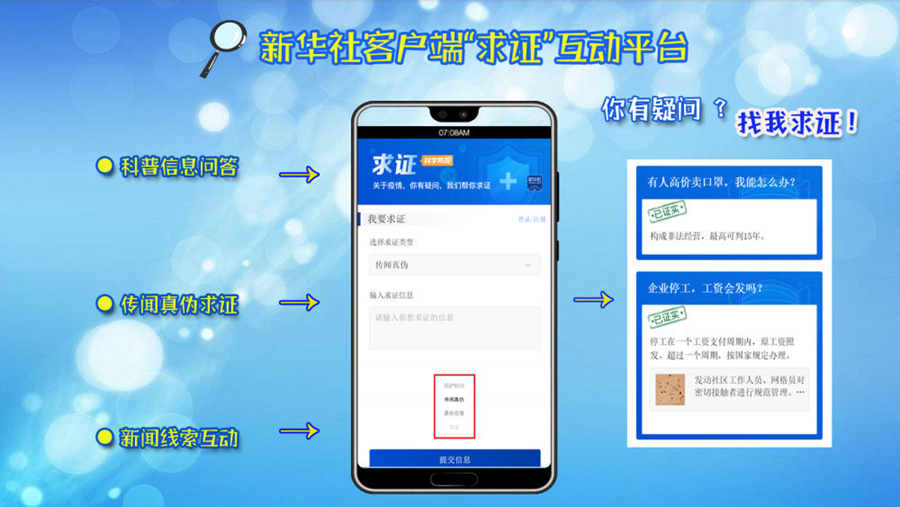 新華社北京2月12日電(記者 程昊)“新型冠狀病毒來襲,哪些人容易中招?”“聽說我們小區(qū)馬上就要全封閉了,是真的嗎?”……面對大量信息,不少網(wǎng)友感覺真假難辨,期待解答。新華社客戶端今日推出“求證”互動平臺,旨在架起網(wǎng)民和權(quán)威機構(gòu)間的橋梁,傳遞權(quán)威信息,回應(yīng)網(wǎng)友關(guān)切,幫助網(wǎng)友在疫情防控期間獲取真實有效的信息和科普知識,去偽存真,解疑釋惑。