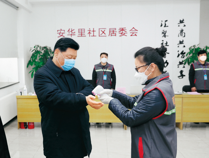 2020年2月10日,中共中央總書記、國家主席、中央軍委主席習近平在北京調研指導新冠肺炎疫情防控工作。這是習近平來到朝陽區(qū)安貞街道安華里社區(qū),了解基層一線疫情聯(lián)防聯(lián)控情況。 新華社記者 鞠鵬/攝