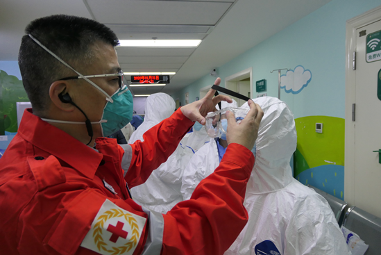 上海醫(yī)療隊隊員們互相在防護服上寫名字(拍攝者:隊員王瑞蘭)