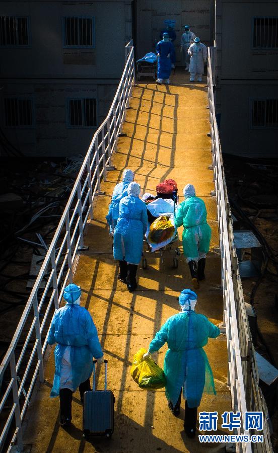 1月24日,武漢大學(xué)中南醫(yī)院重癥隔離病房的醫(yī)護人員將一名好轉(zhuǎn)的病人轉(zhuǎn)移至普通隔離病房。 新華社記者 熊琦 攝