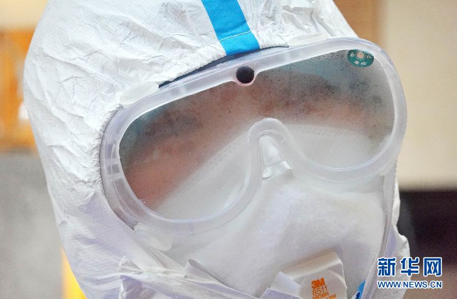 1月29日,北京宣武醫(yī)院一名醫(yī)護人員在武漢駐地練習(xí)防護技能時護目鏡內(nèi)充滿霧氣。 新華社記者 才揚 攝