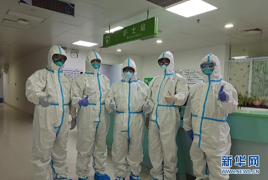 毛青(左二)和同事在金銀潭醫(yī)院一線病房工作時合影(1月26日攝)。 新華社發(fā)