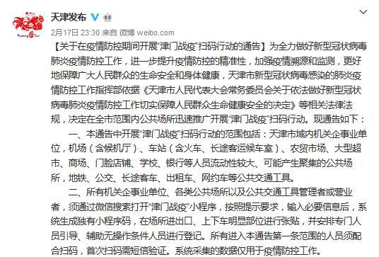 據(jù)天津市政府新聞辦微博消息,天津市新型冠狀病毒感染的肺炎疫情防控工作指揮部日前發(fā)布通告稱,自2月17日起,天津市域內(nèi),凡進(jìn)入機(jī)關(guān)企事業(yè)單位,機(jī)場(chǎng)、車(chē)站、商場(chǎng)、學(xué)校、銀行等公共場(chǎng)所,乘坐地鐵、公交、出租車(chē)等公共交通工具,所有人員須配合掃碼,系統(tǒng)采集的數(shù)據(jù)僅用于疫情防控工作。
