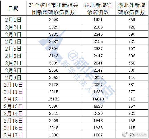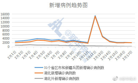 2月17日,31個?。ㄗ灾螀^(qū)、直轄市)和新疆生產建設兵團報告新增新冠肺炎確診病例1886例,湖北新增確診病例1807例。這就是說,除湖北外的30個省區(qū)市和新疆生產建設兵團昨日新增確診79例,這是自2月3日來新增病例到達高點890例以來的首次兩位數(shù)報告,也是第14連降。?