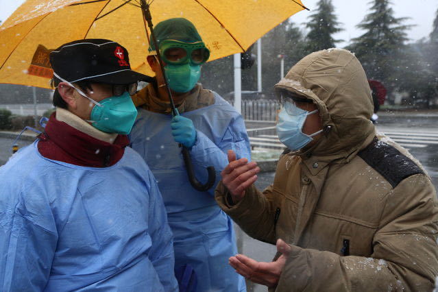 2月15日,武漢東西湖方艙醫(yī)院,武漢大學中南醫(yī)院副院長、東西湖方艙醫(yī)院副院長李志強(左一)在雪中等待為治愈患者發(fā)放出院證明。趙迪/攝