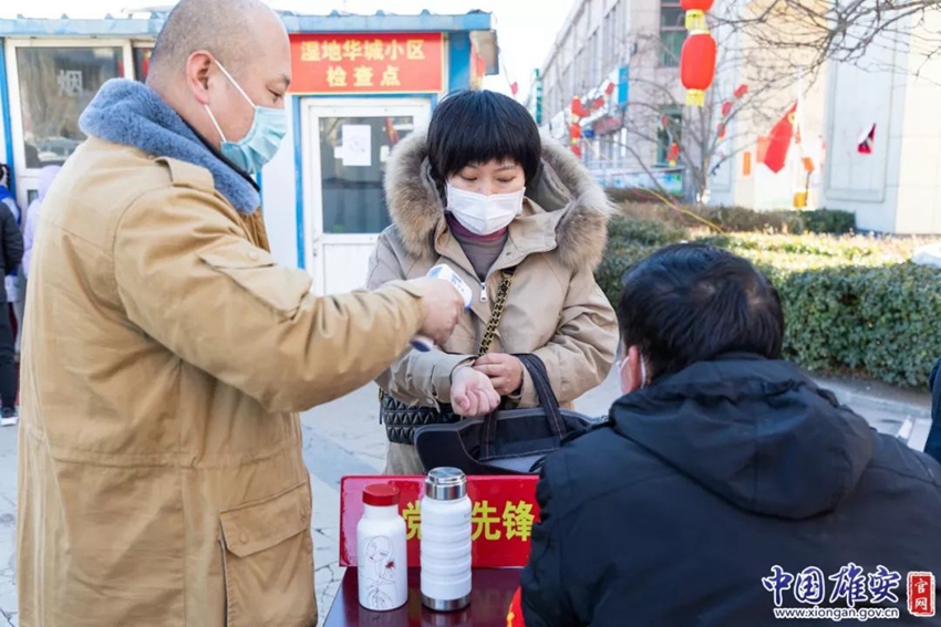 疫情防控工作人員為濕地華城小區(qū)住戶辦理出入證。中國雄安官網(wǎng)記者毛鶴然 攝