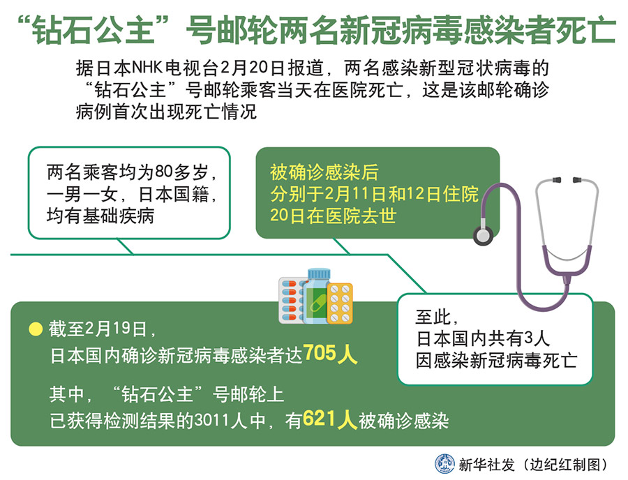 NHK電視臺(tái)報(bào)道稱,兩名乘客均為80多歲,一男一女,日本國(guó)籍,均有基礎(chǔ)疾病,被確診感染后分別于2月11日和12日住院,20日在醫(yī)院去世。至此,日本國(guó)內(nèi)共有3人因感染新冠病毒死亡。