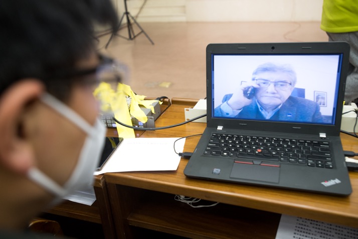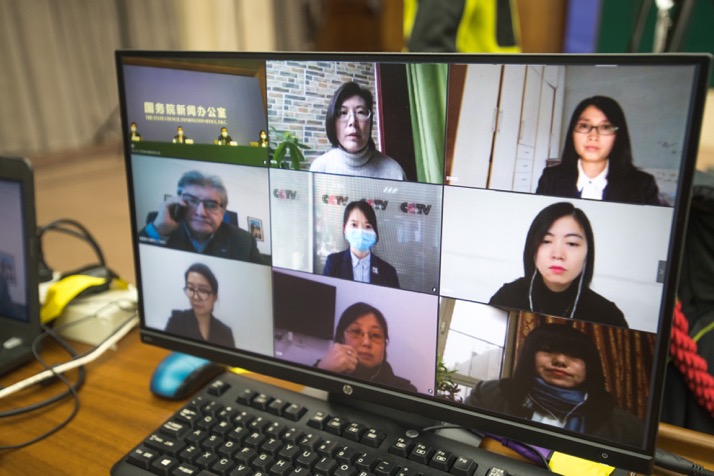 記者通過(guò)視頻連線(xiàn)提問(wèn)。新華社記者肖藝九攝。