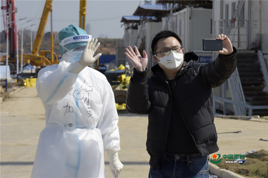 2月20日,治愈出院的萬(wàn)先生錄制在火神山醫(yī)院的最后一條短視頻。中國(guó)軍網(wǎng)記者范顯海 攝