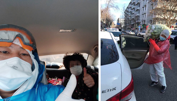 圖為滴滴司機(jī)程科意接出院的社區(qū)居民回家(圖左)程科意幫助搬運(yùn)蔬菜(圖右)