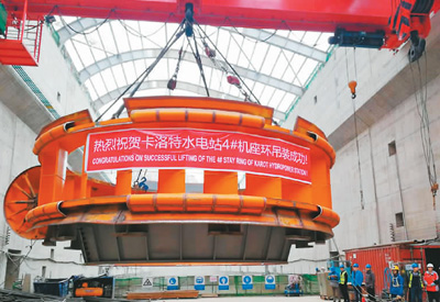 “中巴經(jīng)濟走廊”優(yōu)先實施項目巴基斯坦卡洛特水電站最后一套座環(huán)、基礎環(huán)成功吊裝。三峽集團供圖
