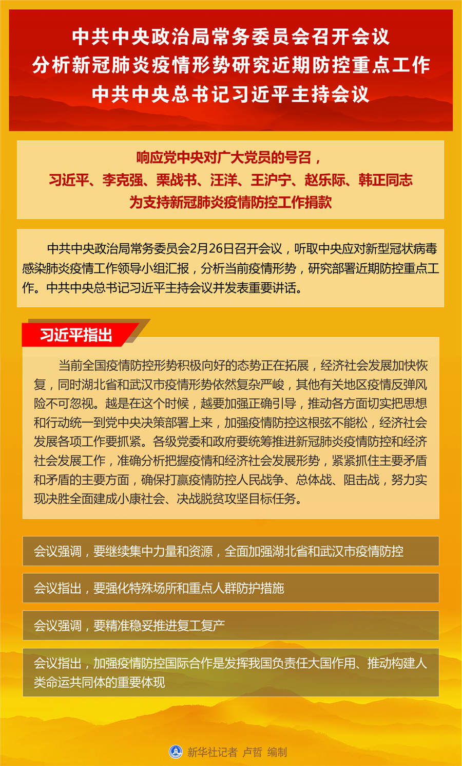 新華社北京2月26日電 中共中央政治局常務(wù)委員會(huì)2月26日召開會(huì)議,聽取中央應(yīng)對(duì)新型冠狀病毒感染肺炎疫情工作領(lǐng)導(dǎo)小組匯報(bào),分析當(dāng)前疫情形勢(shì),研究部署近期防控重點(diǎn)工作。中共中央總書記習(xí)近平主持會(huì)議并發(fā)表重要講話。