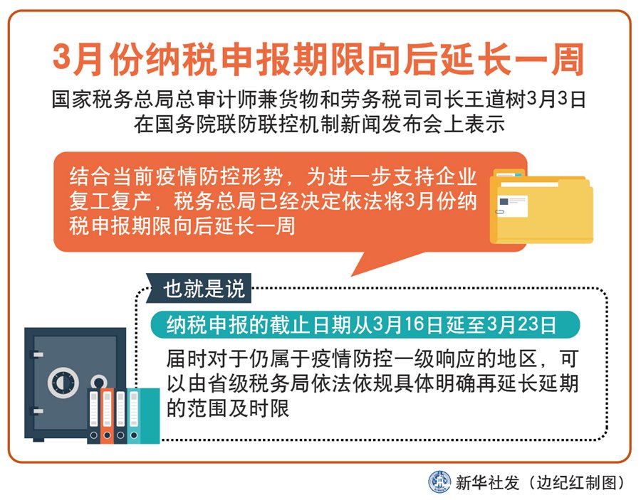 新華社北京3月3日電(記者郁瓊源 王秉陽)國家稅務(wù)總局總審計(jì)師兼貨物和勞務(wù)稅司司長王道樹3日在國務(wù)院聯(lián)防聯(lián)控機(jī)制新聞發(fā)布會(huì)上表示,結(jié)合當(dāng)前疫情防控形勢,為進(jìn)一步支持企業(yè)復(fù)工復(fù)產(chǎn),稅務(wù)總局已經(jīng)決定依法將3月份納稅申報(bào)期限向后延長一周。
