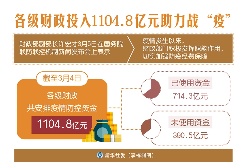 新華社北京3月5日電(記者申鋮、劉紅霞)財政部副部長許宏才5日在國務(wù)院聯(lián)防聯(lián)控機制新聞發(fā)布會上表示,疫情發(fā)生以來,財政部門積極發(fā)揮職能作用,切實加強防疫經(jīng)費保障,截至3月4日,各級財政共安排疫情防控資金1104.8億元。