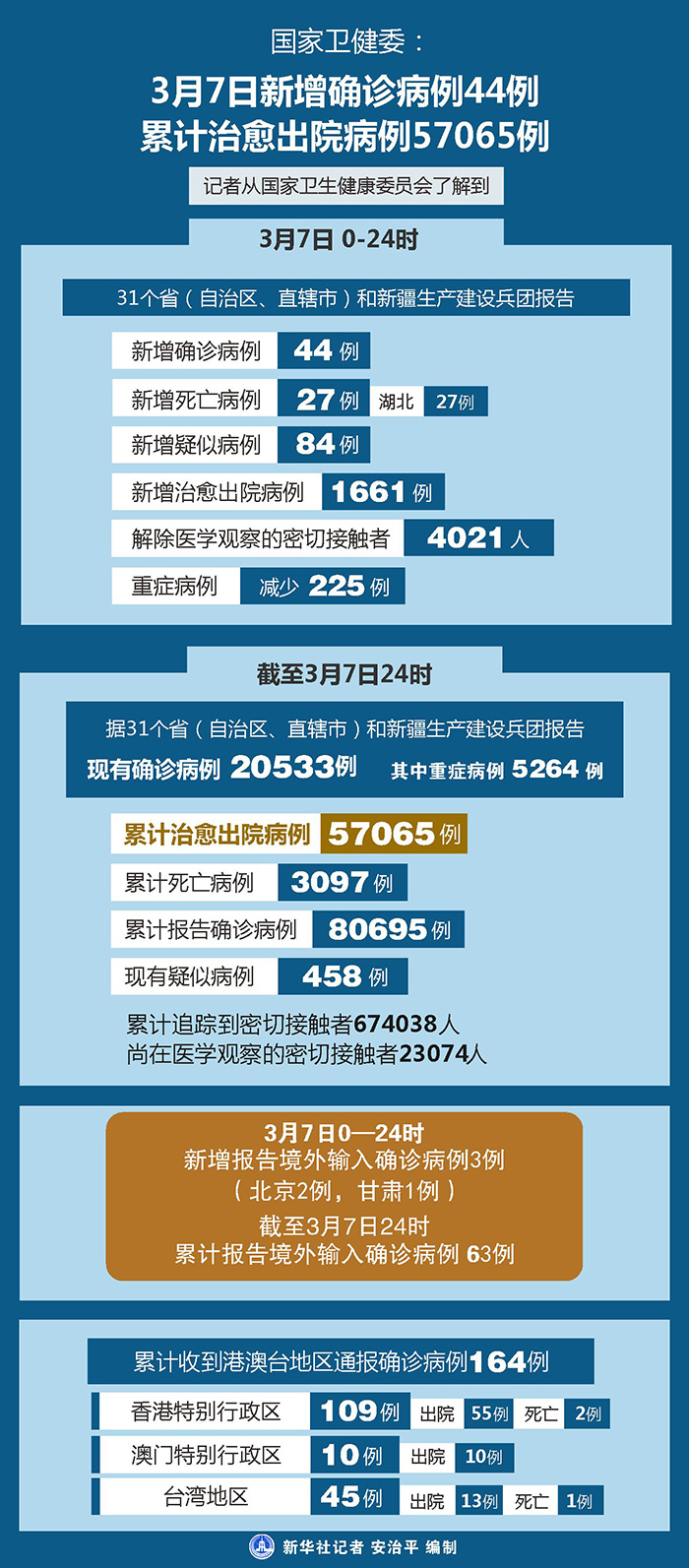 截至3月7日24時,據(jù)31個?。ㄗ灾螀^(qū)、直轄市)和新疆生產(chǎn)建設(shè)兵團(tuán)報(bào)告,現(xiàn)有確診病例20533例(其中重癥病例5264例),累計(jì)治愈出院病例57065例,累計(jì)死亡病例3097例,累計(jì)報(bào)告確診病例80695例,現(xiàn)有疑似病例458例。累計(jì)追蹤到密切接觸者674038人,尚在醫(yī)學(xué)觀察的密切接觸者23074人。