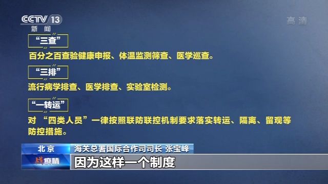 海關總署國際合作司司長 張寶峰:“三查”“三排”“一轉運”是我們海關多年來摸索探索形成的一個比較成熟的、規(guī)范的應對重大國外疫情傳入的制度模式。運行這個模式,主要有三個方面,第一就是海關的執(zhí)行,海關在執(zhí)行方面我們是非常有信心的。