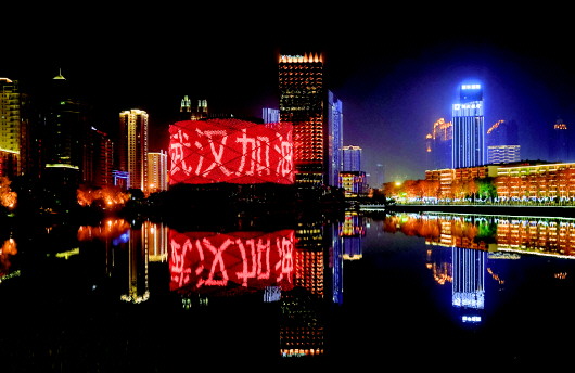 ▲1月31日,武漢市武昌區(qū)水果湖地區(qū)一處建筑外墻打出“武漢加油”字樣。 新華社記者程敏攝