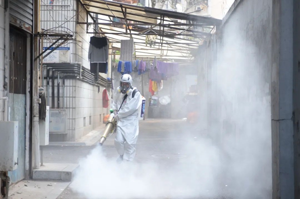 2月5日,長沙藍天救援隊隊員在長沙市馬王街社區(qū)內(nèi)消毒殺菌。新華社發(fā)(陳振海攝)
