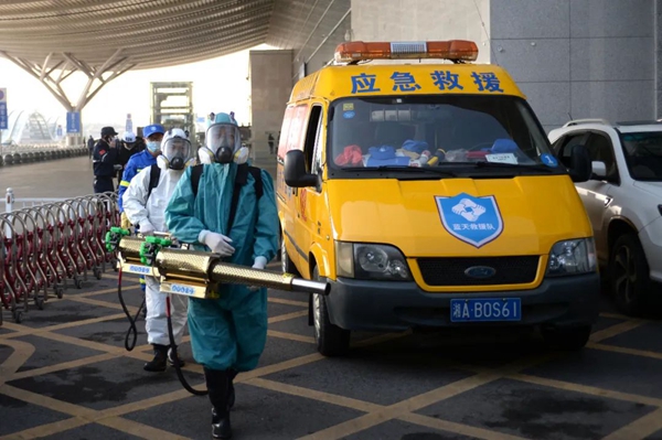 2月5日,長沙藍天救援隊隊員準備進入長沙磁浮高鐵站消毒殺菌。新華社發(fā)(陳振海攝)