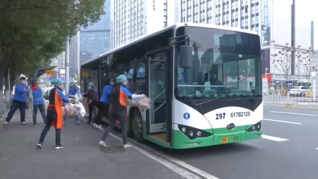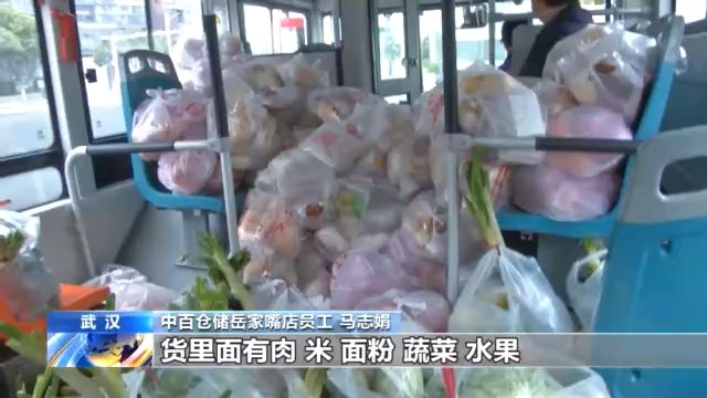 十點(diǎn)整,運(yùn)送1500包愛(ài)心菜和500多包其它生活物資的專(zhuān)車(chē)來(lái)了:一輛297路公交車(chē)。為了提高運(yùn)輸效率,武漢市公交集團(tuán)承接了全市社區(qū)團(tuán)購(gòu)的集中配送任務(wù)。幾十名超市員工組成“人力傳送帶”把物資送上車(chē)。很快,公交車(chē)出發(fā)了。