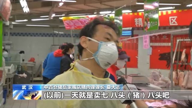 中百倉(cāng)儲(chǔ)岳家嘴店精肉課課長(zhǎng) 夏大志:以前賣(mài)8頭豬16片,現(xiàn)在賣(mài)15頭 30片,冷凍肉一天要賣(mài)一兩噸,箱子裝的100多箱。