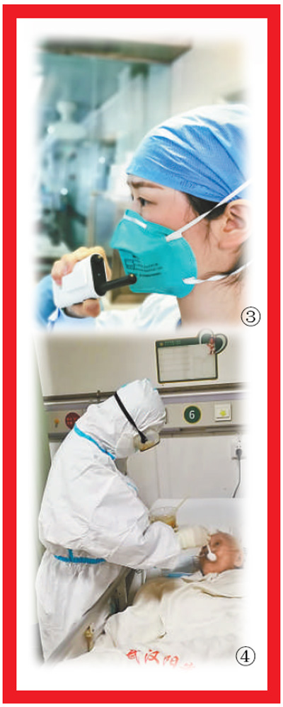 從1月3日至今,今年26歲的武漢市肺科醫(yī)院護士朱靜(圖③)已經(jīng)在ICU病房連續(xù)工作了兩個多月。
