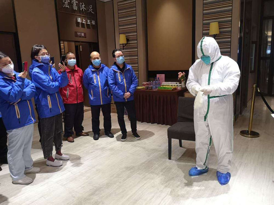 圖為四川大學(xué)華西醫(yī)院援湖北醫(yī)療隊(duì)朱仕超(右二)與同事相互鼓勵(lì)打氣。