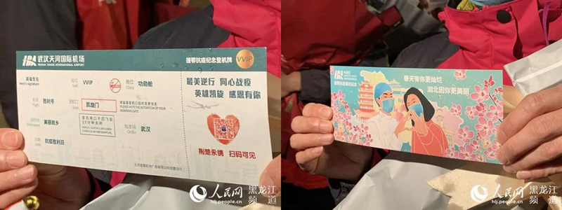 公寶霞是黑龍江省第五批援鄂醫(yī)療隊(duì)隊(duì)員,作為首批凱旋回鄉(xiāng)的醫(yī)護(hù)人員,她格外興奮?!澳康牡貙?xiě)著‘美麗的故鄉(xiāng)’,航班號(hào)是‘勝利號(hào)’,艙位是‘功勛艙’。”公寶霞說(shuō),這是武漢天河機(jī)場(chǎng)專(zhuān)門(mén)為他們準(zhǔn)備的紀(jì)念登機(jī)牌,特別有意義。