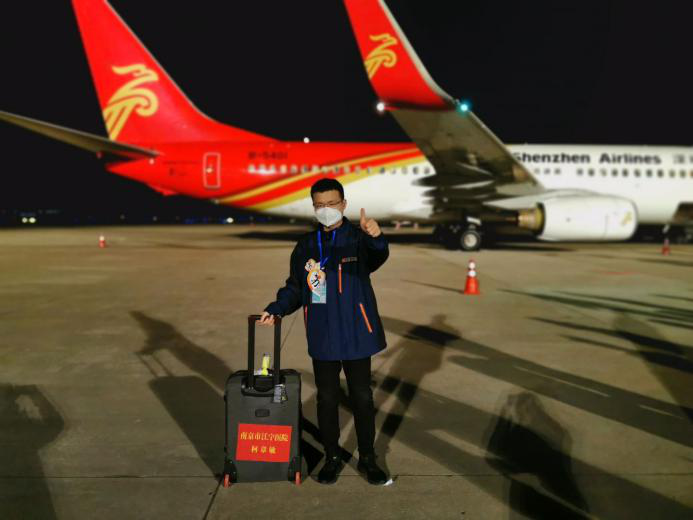 3月17日晚,柯章敏結(jié)束50多天的支援,從武漢乘坐飛機(jī)抵達(dá)南京祿口機(jī)場(chǎng)。受訪者供圖