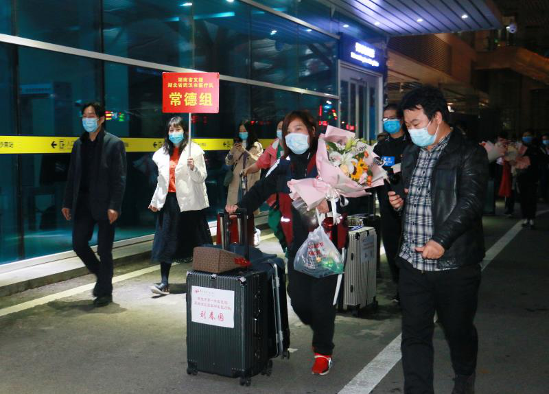飛機(jī)落地后,走出艙門(mén)的醫(yī)護(hù)人員受到了家鄉(xiāng)人民的熱烈歡迎?!白叱雠撻T(mén)的第一感覺(jué)是回家真好!我是第二個(gè)出艙的,一下飛機(jī)就看到醫(yī)院的領(lǐng)導(dǎo)和同事們來(lái)接我們回家,心里特別溫暖,特別的感動(dòng)?,F(xiàn)在最想做的,是結(jié)束隔離后回家看看親人,然后徹底地放松一下?!蹦喜髮W(xué)二附院呼吸與危重癥醫(yī)學(xué)科副主任護(hù)師余嬌說(shuō),“雖然我們回來(lái)了,但武漢還有我們的隊(duì)友,希望他們?cè)缛掌桨矚w來(lái)。