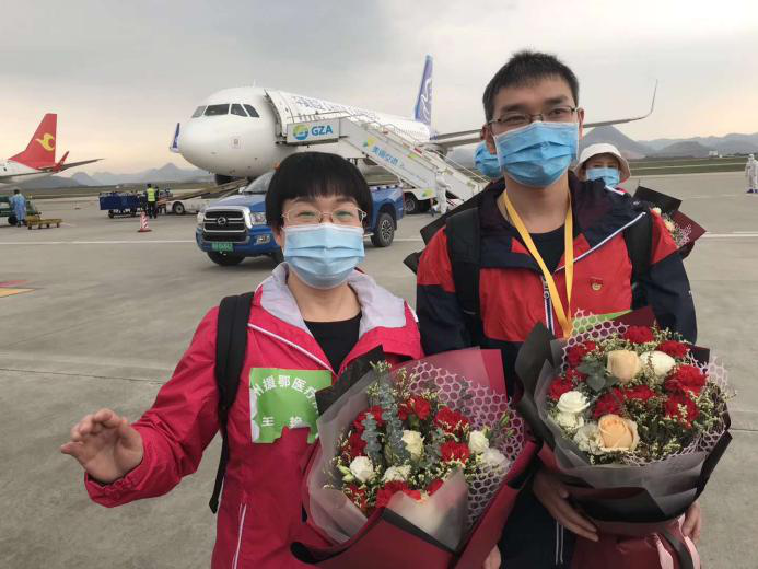 貴州省援鄂醫(yī)療隊(duì)隊(duì)員王艷(左一)平安返黔。開(kāi)陽(yáng)宣傳部供圖