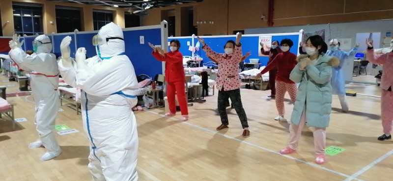 青海醫(yī)護(hù)人員帶領(lǐng)患者們一起做運(yùn)動(dòng)。青海省支援湖北護(hù)理醫(yī)療隊(duì)供圖